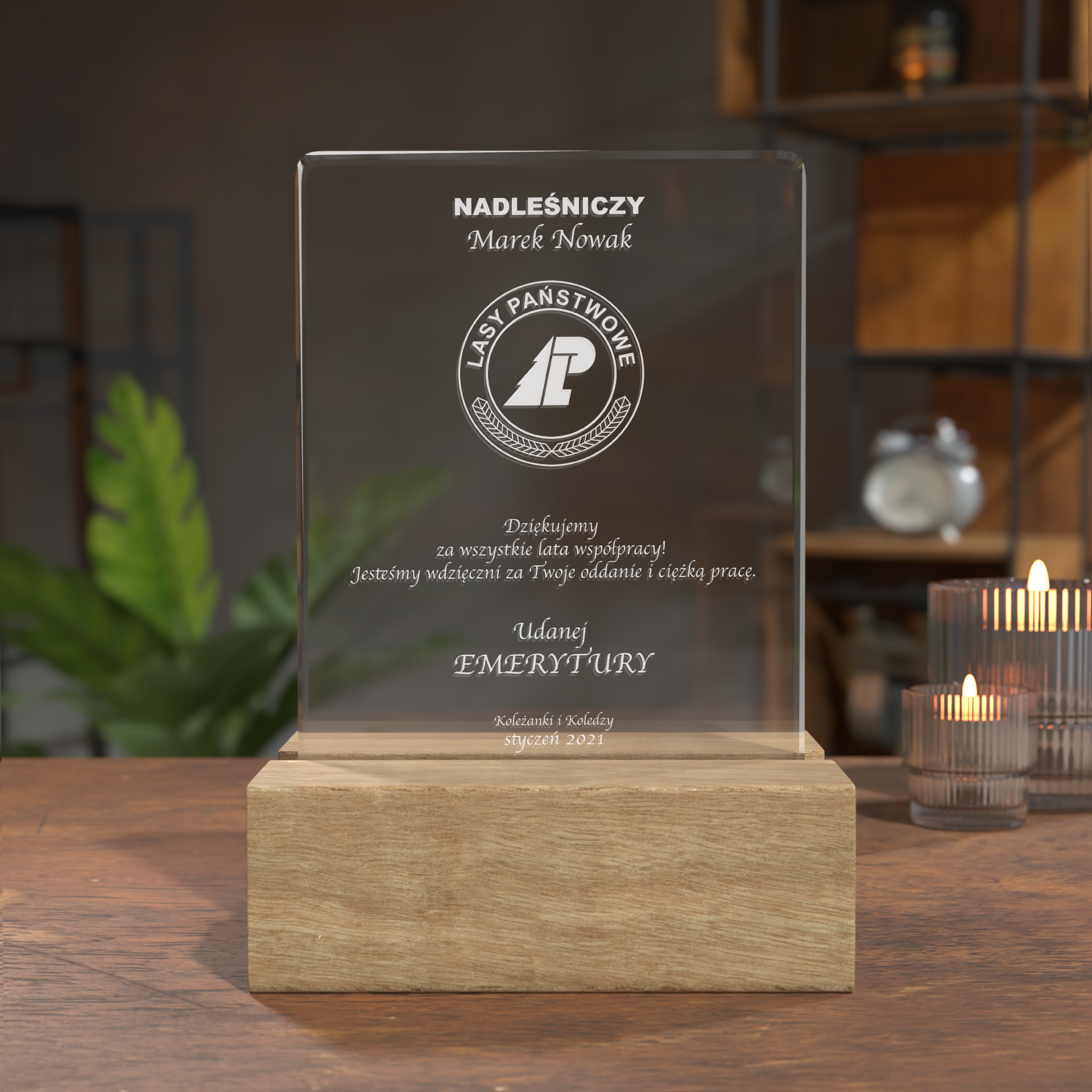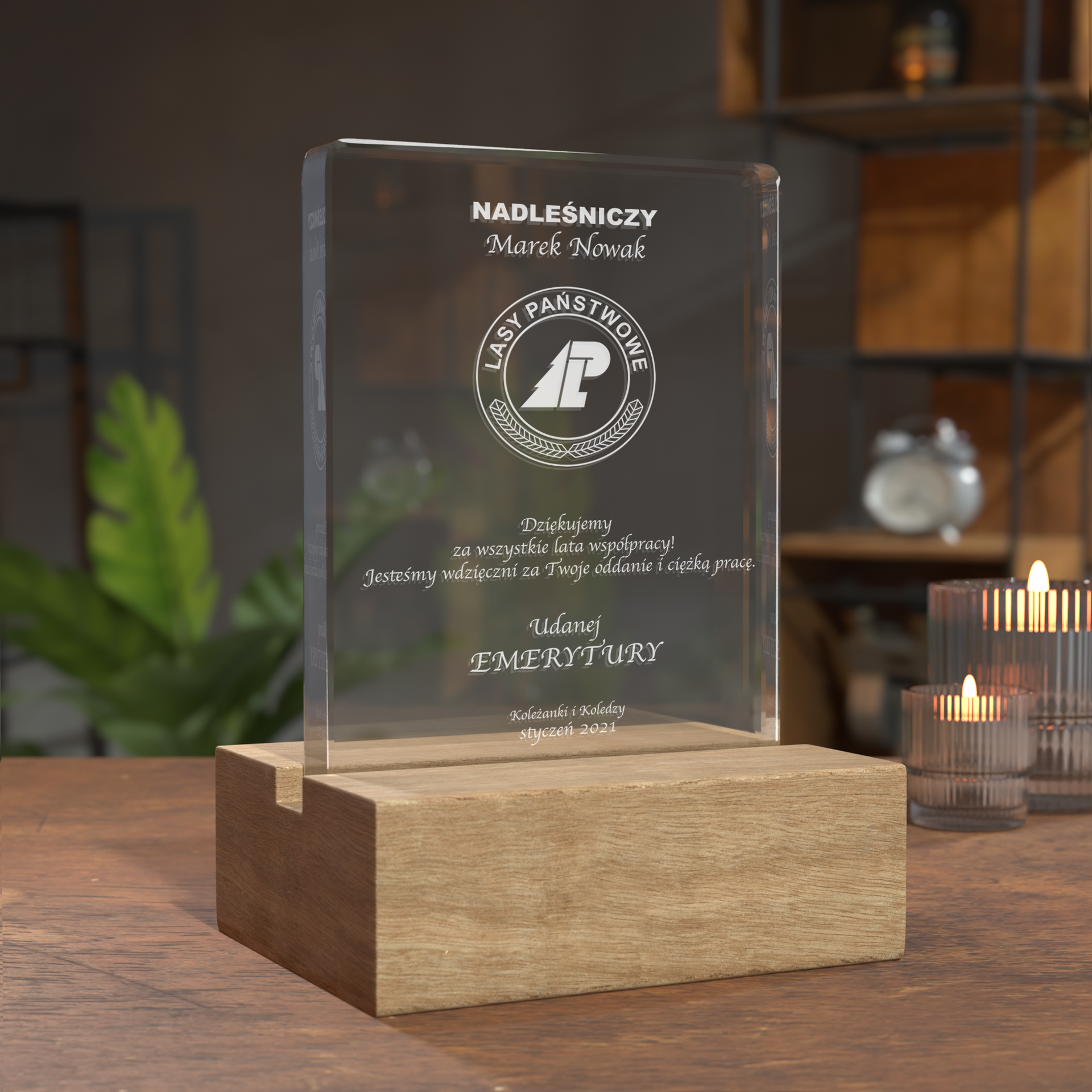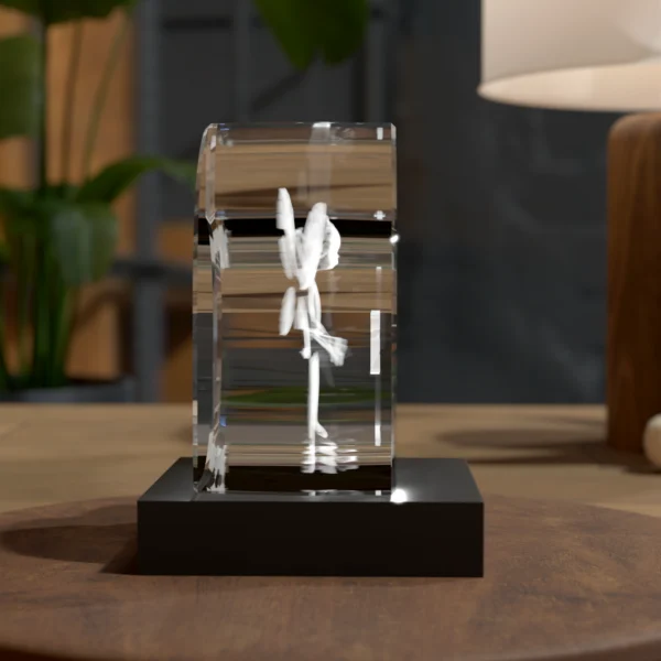 • Opcjonalne dodatki — np. podstawa, która podświetli kryształ i podkreśli grawer, co zwiększy efekt wizualny.