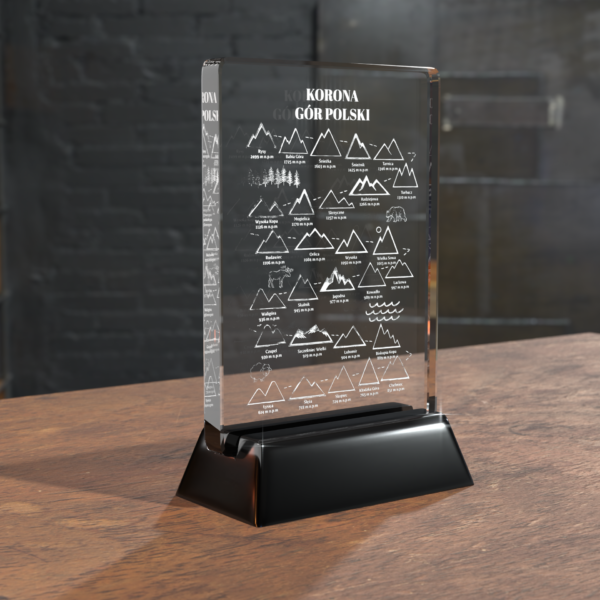 Precyzyjne grawerowanie 2D – motyw Korony Gór Polskich i Świata wykonany laserowo wewnątrz kryształu, oddający charakterystyczne kontury najwyższych szczytów.