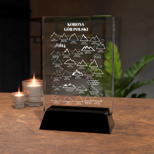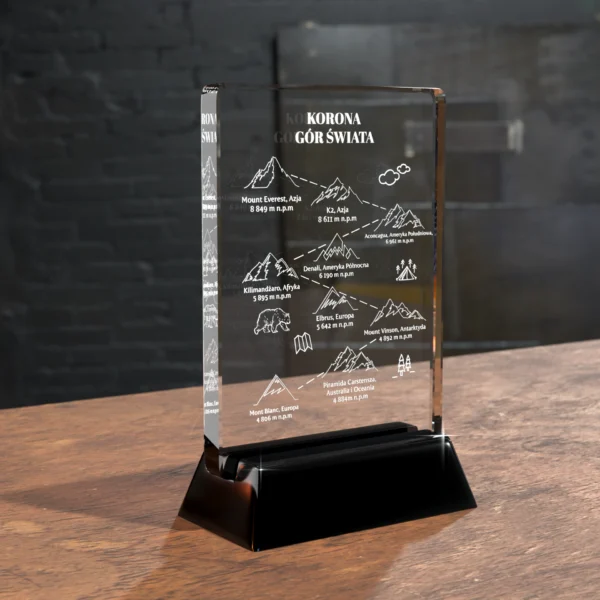 Przywołaj wspomnienia wypraw i zdobytych szczytów dzięki kryształowi 2D z wygrawerowanym motywem „Korony Gór Polskich i Świata”. To pamiątka, która doskonale prezentuje się jako wyjątkowy prezent dla miłośnika górskich wędrówek.